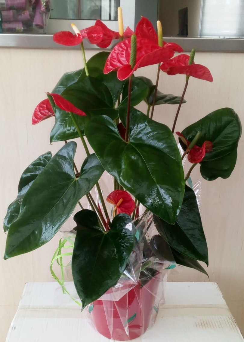 Anthurium 60cm de altura con maceta de cerámica roja y decoración, más tarjeta